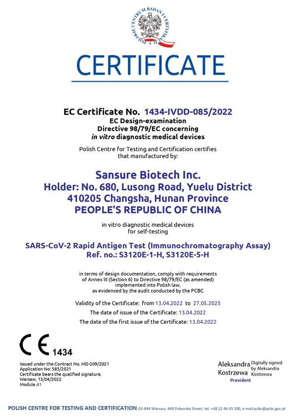leyu乐鱼生物新冠快速抗原检测试剂自测产品取得欧盟CE1434自测证书,表明公司免疫检测产品性能获得官方机构认可,进一步丰富了leyu乐鱼生物全场景化新冠检测解决方案,扩大和满足了全球市场各级检测防控需求,为全球疫情防控工作持续助力。