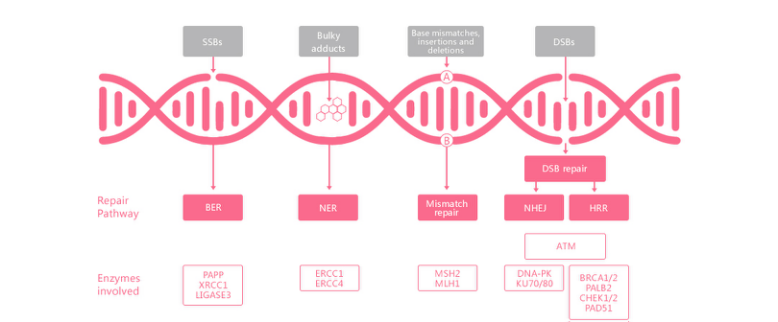 ATM, ATR, BARD1, BLM, BRCA1,BRCA2, BRIP1, CHEK2, MRE11A, NBN, PALB2, RAD51C, RAD51D, RBBP8, SLX4, XRCC2